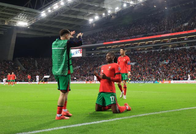 11月15日,欧国联小组赛A组第5轮,葡萄牙队主场迎战波兰队。之前3胜1平积10分,领先第二的克罗地亚队3分,领先第三的波兰队6分,最后两轮比赛,葡萄牙队只需再拿一分就能以小组头两名出线。但对阵莱万多夫斯基因伤缺阵的波兰队,主场作战的葡萄牙队上半场踢得非常差。下半场,拉斐尔·莱昂首开纪录,葡萄牙队一发而不可收,连进了5球。最后时刻,波兰队打进挽回颜面一球。5战4胜1平积13分,葡萄牙队提前一轮以小组第一身份出线。